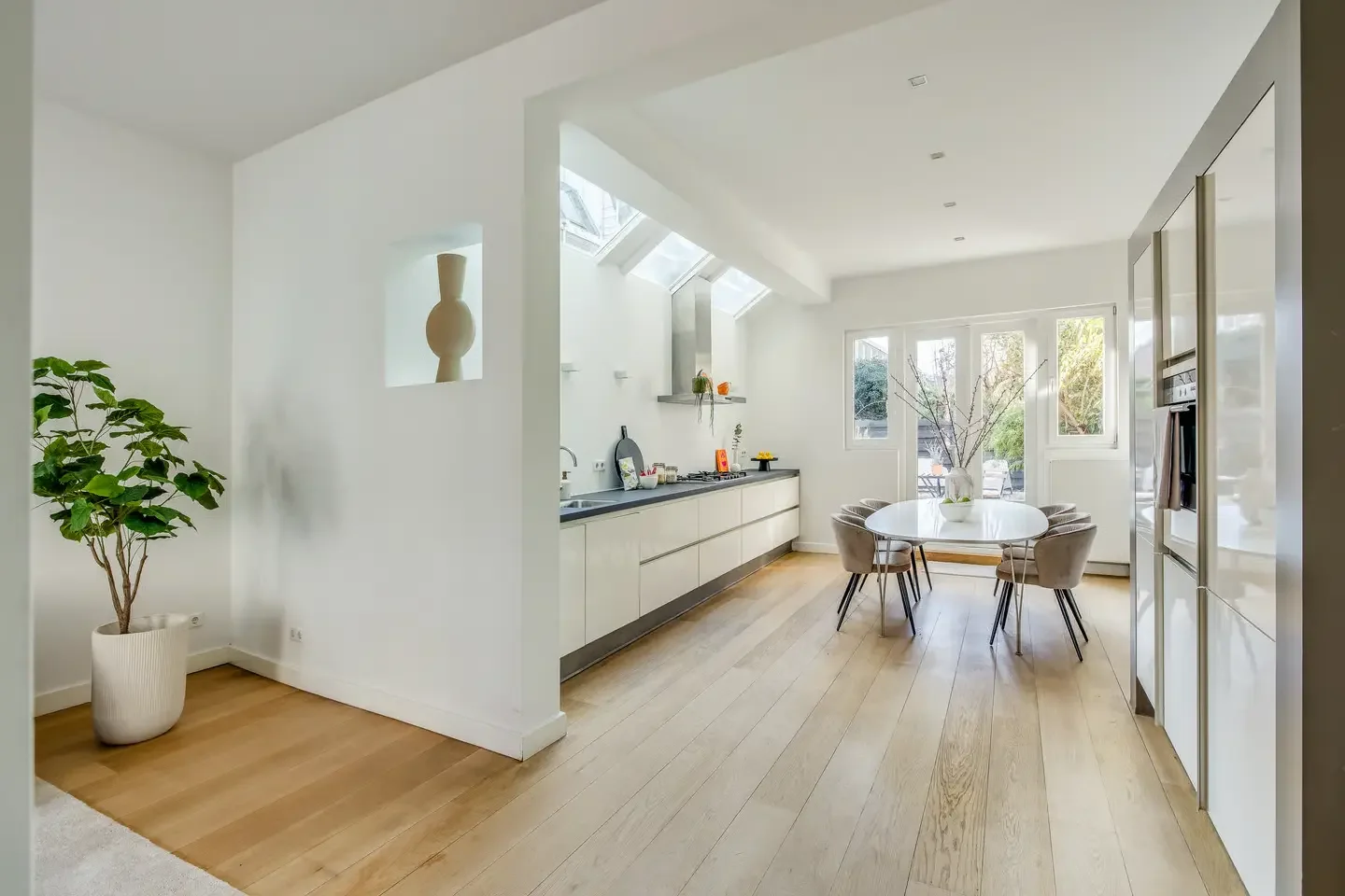 Daglicht verkoopt. Maak ramen vrij van zware gordijnen en lamellen en laat licht tot de vloer komen. Werk met een combinatie van basisverlichting en enkele sfeerpuntjes bij zithoek en eettafel.